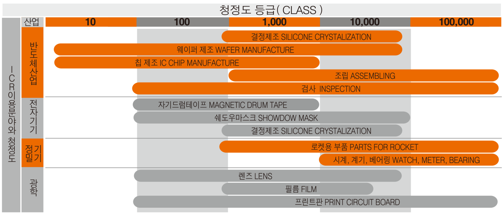 맞는 환경을 조성합니다. 이러한 목적의 청정공간을 ICR(Industrial Clean Room)이라하며 작업공정에 따라 각기